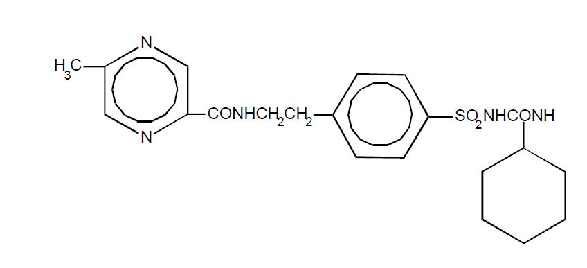 The Chemical Abstracts name of glipizide is 1-cyclohexyl-3-[[p-[2-(5-methylpyrazinecarboxamido)ethyl]phenyl]sulfonyl]urea. The molecular formula is C21H27N5O4S; the molecular weight is 445.55; the structural formula is shown below: