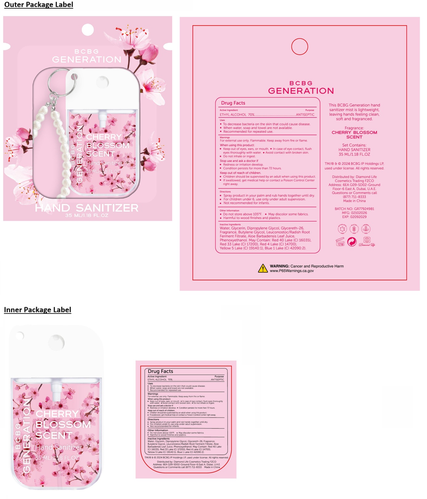 BCBG GENERATION Hand Sanitizer CHERRY BLOSSOM SCENT by is a Otc medication manufactured, distributed, or labeled by Diamond Life Cosmetics Trading FZCO. Drug facts, warnings, and ingredients follow.