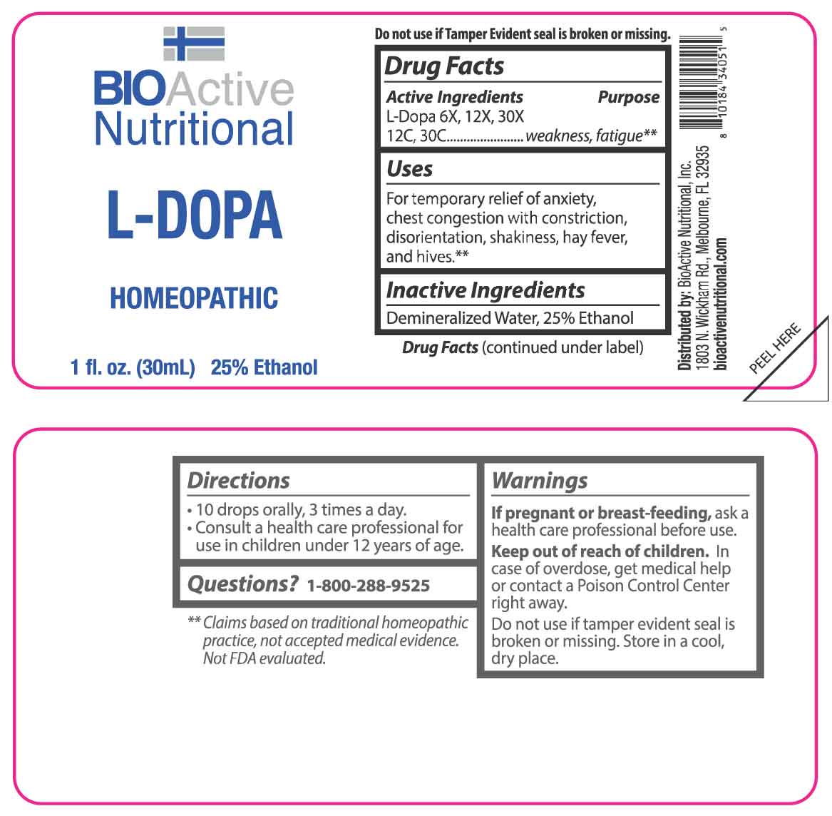 L-Dopa by is a Homeopathic medication manufactured, distributed, or labeled by BioActive Nutritional, Inc., Apotheca Company. Drug facts, warnings, and ingredients follow.