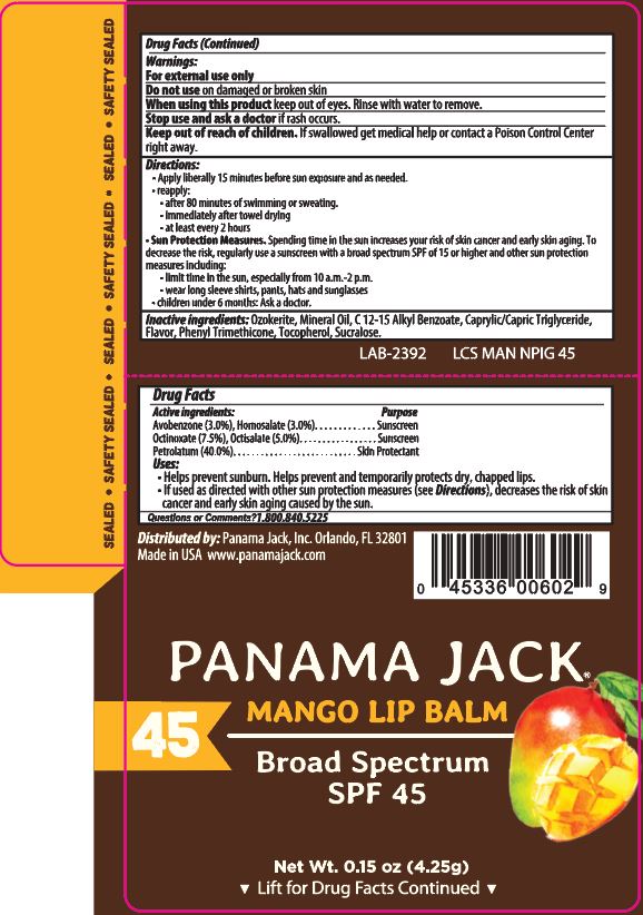 Panama Jack SPF 45 Mango Lip Balm by is a Otc medication manufactured, distributed, or labeled by Panama Jack, OraLabs. Drug facts, warnings, and ingredients follow.