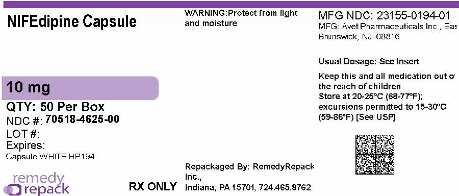 Nifedipine Capsules, USP are available as white opaque, oblong soft gelatin capsules containing 10 mg of nifedipine. Each capsule is imprinted with "HP 194" in black ink. They are supplied as follows: