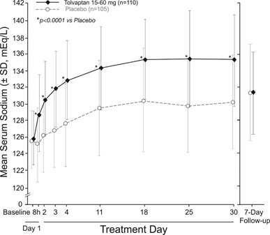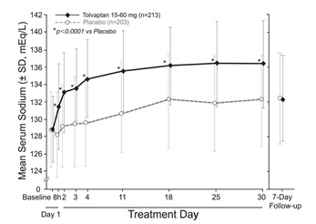 Figure 1 shows the change from baseline in serum sodium by visit in patients with serum sodium <135 mEq/L. Within 7 days of tolvaptan discontinuation, serum sodium concentrations in tolvaptan-treated patients declined to levels similar to those of placebo-treated patients.