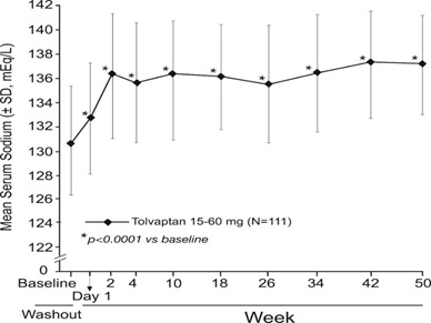 In the open-label study SALTWATER, 111 patients, 94 of them hyponatremic (serum sodium <135 mEq/L), previously on tolvaptan or placebo therapy, were given tolvaptan as a titrated regimen (15 to 60 mg once daily) after having returned to standard care for at least 7 days. By this time, their baseline mean serum sodium concentration had fallen to between their original baseline and post-placebo therapy level. Upon initiation of therapy, average serum sodium concentrations increased to approximately the same levels as observed for those previously treated with tolvaptan and were sustained for at least a year. Figure 3 shows results from 111 patients enrolled in the SALTWATER Study.