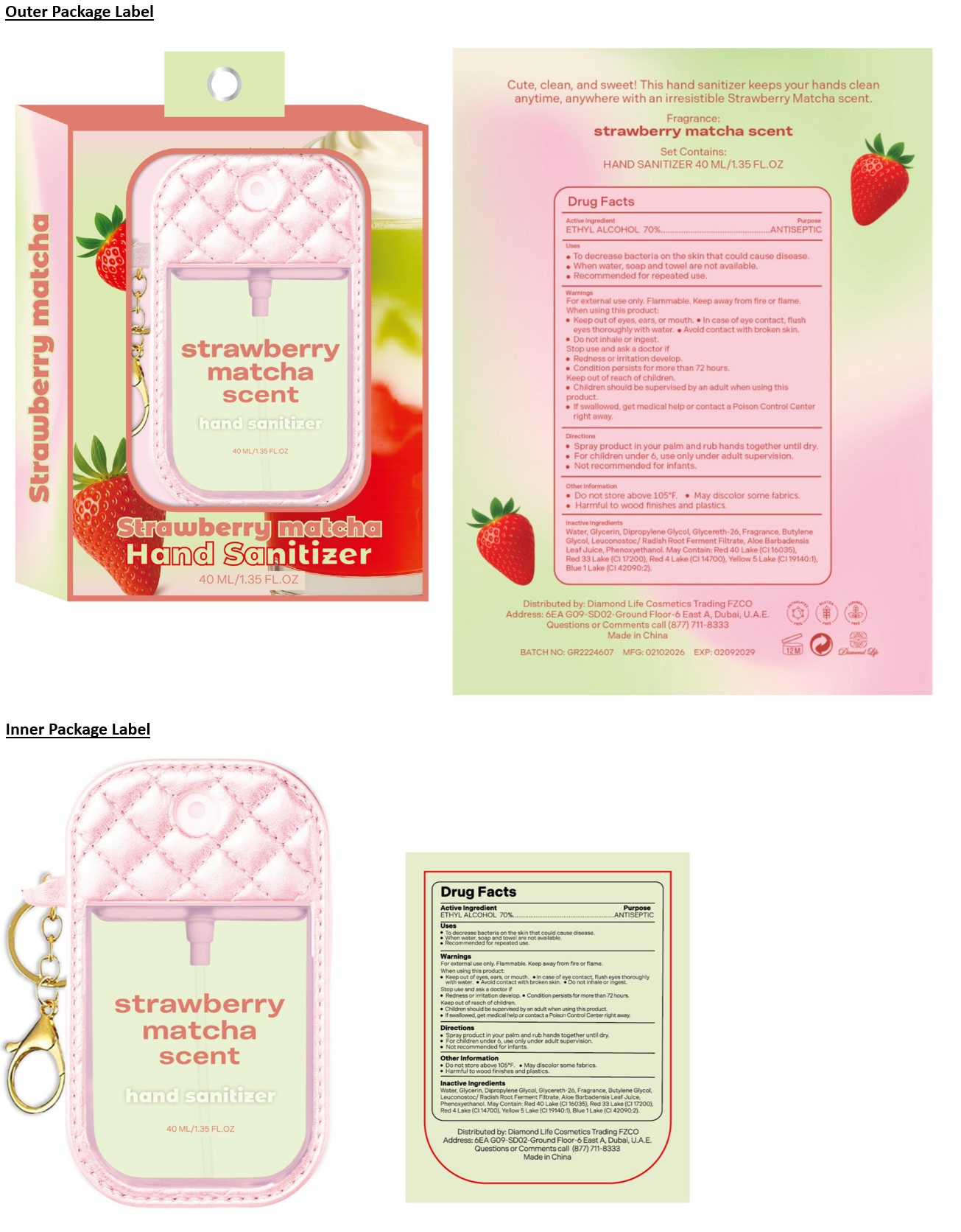hand sanitizer strawberry matcha scent by is a Otc medication manufactured, distributed, or labeled by Diamond Life Cosmetics Trading FZCO. Drug facts, warnings, and ingredients follow.