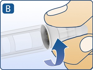 Push outer needle cap containing the needle straight onto the pen, then screw needle on until secure. (See Figure B).