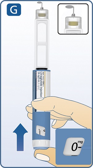 Keep needle pointing up and press dose button until the black line of 0 mg lines up with pointer (See Figure G). Repeat steps C and D, up to 6 times, until a drop of liraglutide injection appears at the needle tip.