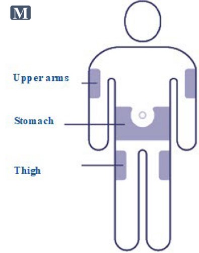 Choose your injection site in either the stomach (abdomen), thigh, or upper arm (only if caregiver administered) and wipe the skin with an alcohol swab (See Figure M). Let the injection site dry before you inject your dose.