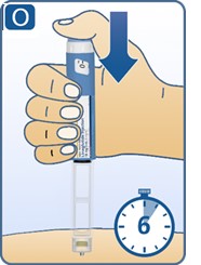 Keep the dose button pressed down and make sure that you keep the needle under the skin for a full count of 6 seconds to make sure the full dose is injected. Keep your thumb on the injection button until you remove the needle from your skin (See Figure O).
