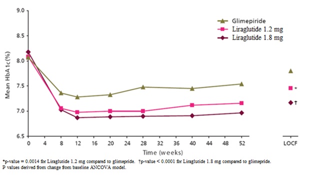 The safety of liraglutide in patients with type 2 diabetes mellitus was evaluated in 5 glycemic control, placebo-controlled trials in adults and one trial of 52 weeks duration in pediatric patients 10 years of age and older [see Clinical Studies (14.1)]. The data in Table 1 reflect exposure of 1,673 adult patients to liraglutide and a mean duration of exposure to liraglutide of 37.3 weeks. The mean age of adult patients was 58 years, 4% were 75 years or older and 54% were male. The population was 79% White, 6% Black or African American, 13% Asian; 4% were of Hispanic or Latino ethnicity. At baseline the population had diabetes for an average of 9 years and a mean HbA1c of 8.4%. Baseline estimated renal function was normal or mildly impaired in 88% and moderately impaired in 12% of the pooled population.