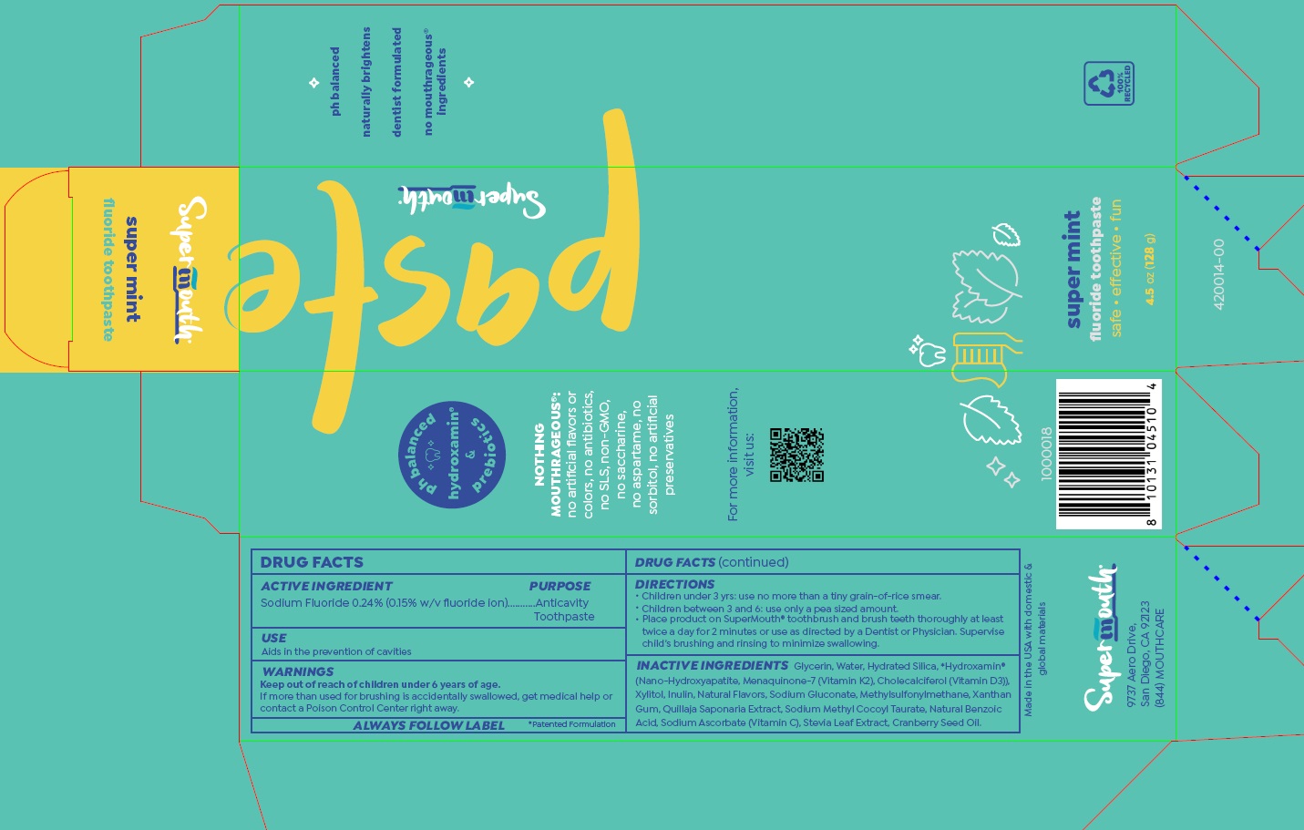 Super Mint by is a Otc medication manufactured, distributed, or labeled by SuperMouth, LLC.. Drug facts, warnings, and ingredients follow.