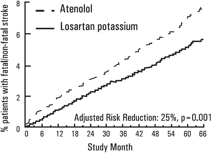 Reduction of the risk of stroke in patients with hypertension and left ventricular hypertrophy. There is evidence that this benefit does not apply to Black patients. (