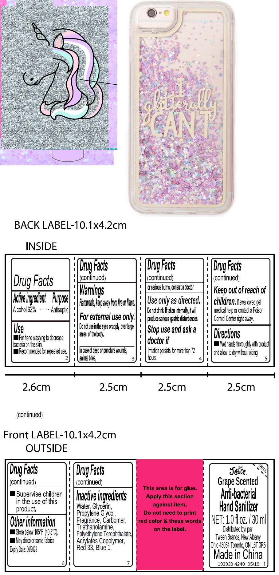 Justice Grape Scented Anti bacterial Hand Sanitizer by is a Otc medication manufactured, distributed, or labeled by Tween Brands, Inc.. Drug facts, warnings, and ingredients follow.
