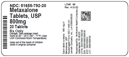Metaxalone Tablets, USP are available as 800 mg pink, capsule shaped, scored tablets, debossed “LCI" on one side and "14" bisect "35" on the other side. Available in bottles of 10 (NDC: 51655-792-53) , 20 (NDC: 51655-792-20) and 30 (NDC: 51655-792-52).