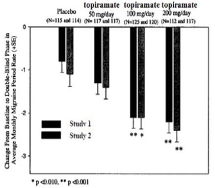 Effectiveness of treatment was assessed by the reduction in migraine headache frequency, as measured by the change in 4-week migraine rate (according to migraines classified by IHS criteria) from the baseline phase to double-blind treatment period in each immediate-release topiramate treatment group compared to placebo in the Intent-To-Treat (ITT) population.