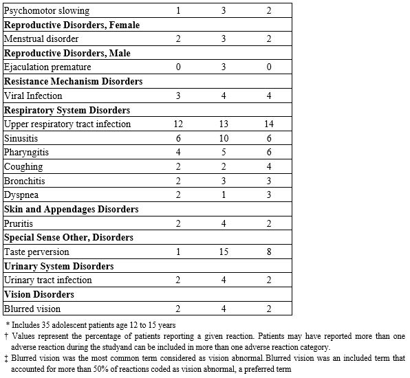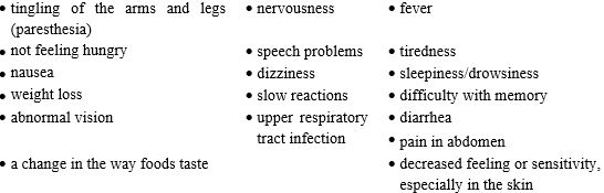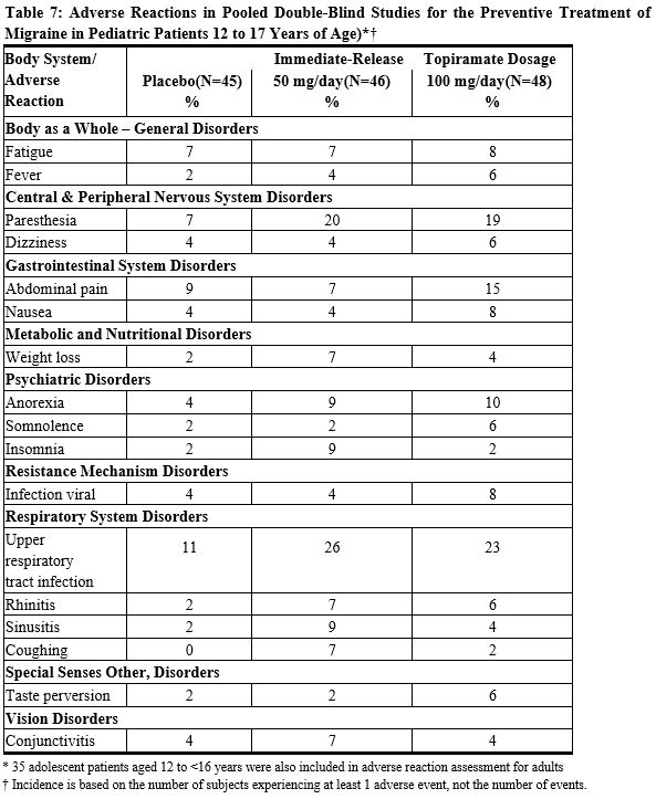 Migraine: Most common (≥5% more frequent than placebo) adverse reactions in adult and pediatric patients were: paresthesia, anorexia, weight loss, difficulty with memory, taste perversion, diarrhea, hypoesthesia, nausea, abdominal pain, and upper respiratory tract infection (6.1). (6)