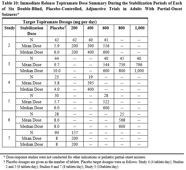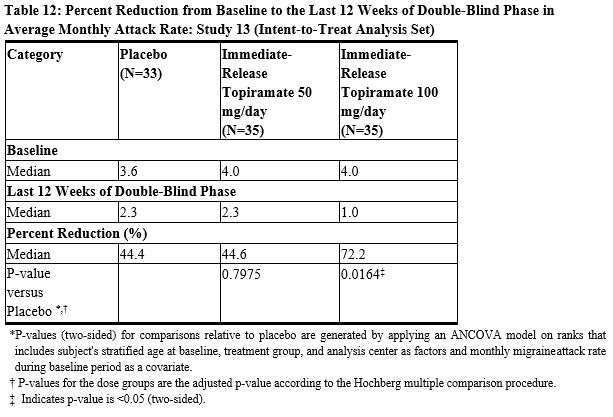 Effectiveness of treatment was assessed by comparing each immediate-release topiramate treatment group to placebo (ITT population) for the percent reduction from baseline to the last 12 weeks of the double-blind phase in the monthly migraine attack rate (primary endpoint). The percent reduction from baseline to the last 12 weeks of the double-blind phase in average monthly migraine attack rate is shown in Table 12. The 100 mg immediate-release topiramate dose produced a statistically significant treatment difference relative to placebo of 28% reduction from baseline in the monthly migraine attack rate.