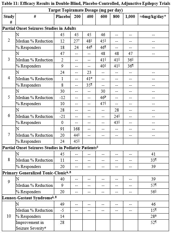 In Study 11, a total of 469 patients (416 females, 53 males) ranging in age from 13 to 70 years, were randomized and provided efficacy data. Two hundred sixty-five patients completed the entire 26-week double-blind phase. The median average daily dosages were 48 mg/day, 88 mg/day, and 132 mg/day in the target dose groups of topiramate 50, 100 and 200 mg/day, respectively.