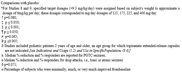 The mean reduction from baseline to the last 12 weeks of the double-blind phase in average monthly attack rate, a key secondary efficacy endpoint in Study 13 (and the primary efficacy endpoint in Studies 11 and 12 of adults) was 3.0 for 100 mg immediate-release topiramate dose and 1.7 for placebo. This 1.3 treatment difference in mean reduction from baseline of monthly migraine rate was statistically significant (p=0.0087).