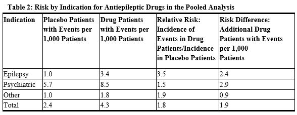 The relative risk for suicidal thoughts or behavior was higher in clinical trials for epilepsy than in clinical trials for psychiatric or other conditions, but the absolute risk differences were similar for the epilepsy and psychiatric indications.