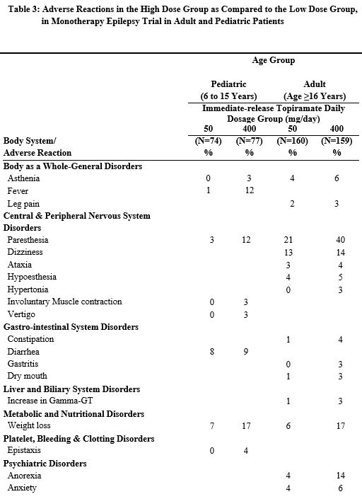 Approximately 21% of the 159 adult patients in the 400 mg/day group who received topiramate as monotherapy in Study 1 discontinued therapy due to adverse reactions. The most common (≥2% more frequent than low-dose 50 mg/day topiramate) adverse reactions causing discontinuation were difficulty with memory, fatigue, asthenia, insomnia, somnolence, and paresthesia.