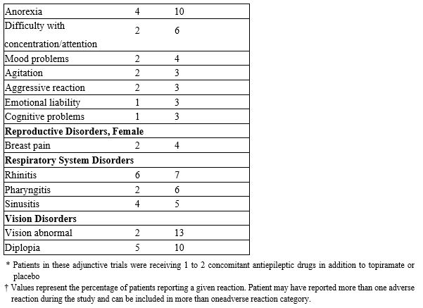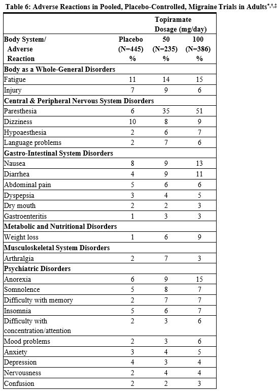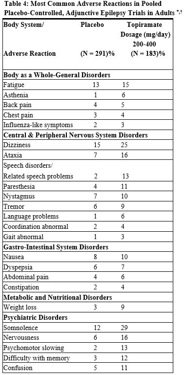The most common adverse reactions in the controlled trial (Study 1) that occurred in adults in the 400 mg/day topiramate group and at an incidence higher (≥10%) than in the 50 mg per day group were: paresthesia, weight loss, and anorexia (see Table 3).