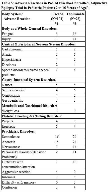 In pediatric epilepsy trials (adjunctive and monotherapy) conducted with topiramate, the incidence of cognitive/neuropsychiatric adverse reactions in pediatric patients was generally lower than that observed in adults. These reactions included psychomotor slowing, difficulty with concentration/attention, speech disorders/related speech problems and language problems. The most frequently reported neuropsychiatric reactions in pediatric epilepsy patients during adjunctive therapy double-blind studies were somnolence and fatigue. The most frequently reported cognitive/neuropsychiatric reactions in pediatric epilepsy patients in the 50 mg/day and 400 mg/day groups during the monotherapy double-blind study were headache, dizziness, anorexia, and somnolence.