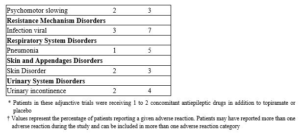 In adult adjunctive epilepsy controlled trials, which used rapid titration (100-200 mg/day weekly increments), and target immediate-release topiramate doses of 200 mg–1000 mg/day, 56% of patients in the 800 mg/day and 1000 mg/day dose groups experienced cognitive-related dysfunction compared to approximately 42% of patients in the 200-400 mg/day groups and 14% for placebo. In this rapid titration regimen, these dose-related adverse reactions began in the titration or in the maintenance phase, and in some patients these events began during titration and persisted into the maintenance phase.
