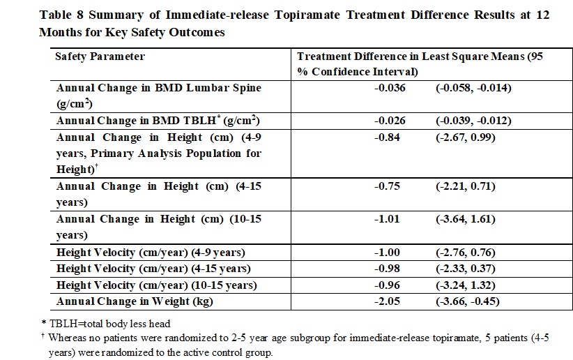 Results of a one-year active-controlled study in pediatric patients (N=63) demonstrated negative effects of immediate-release topiramate monotherapy on bone mineral acquisition via statistically significant decreases in bone mineral density (BMD) measured in lumbar spine and in total body less head [see Use in Specific Populations (8.4)]. Twenty-one percent of immediate-release topiramate-treated patients experienced clinically important reductions in BMD (Z score change from baseline of -0.5 or greater) compared to 0 patients in the control group. Although decreases in BMD occurred across all pediatric age subgroups, patients 6 to 9 years of age were most commonly affected. The sample size and study duration were too small to determine if fracture risk is increased. Decreased BMD in the lumbar spine was correlated with decreased serum bicarbonate, which commonly occurs with topiramate treatment and reflects metabolic acidosis, a known cause of increased bone resorption [see Warnings and Precautions (5.4)]. Although small decreases in some markers of bone metabolism (e.g., serum alkaline phosphatase, calcium, phosphorus, and 1,25-dihydroxyvitamin D) occurred in immediate-release topiramate-treated patients, more significant decreases in serum parathyroid hormone and 25-hydroxyvitamin D, hormones involved in bone metabolism, were observed, along with an increased excretion of urinary calcium.