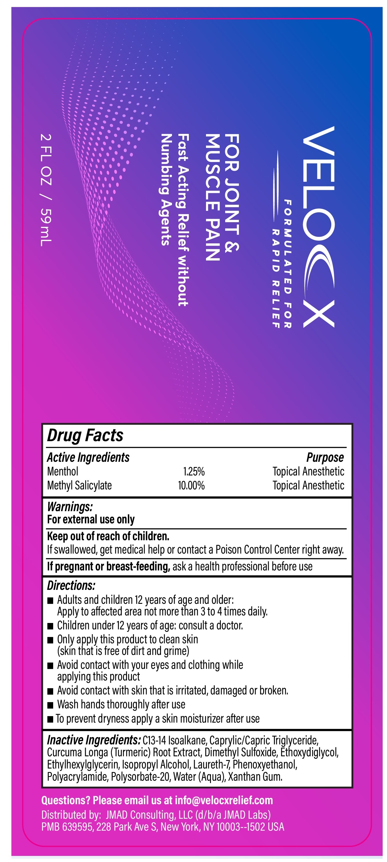 Velocx for Joint and Muscle Pain Roll-On Applicator by is a Otc medication manufactured, distributed, or labeled by JMAD Consulting LLC, dba JMAD Labs, Pure Source, LLC. Drug facts, warnings, and ingredients follow.