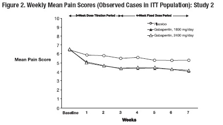 Each study included a 7- or 8-week double-blind phase (3 or 4 weeks of titration and 4 weeks of fixed dose). Patients initiated treatment with titration to a maximum of 900 mg/day gabapentin over 3 days. Dosages were then to be titrated in 600 to 1200 mg/day increments at 3- to 7-day intervals to the target dose over 3 to 4 weeks. Patients recorded their pain in a daily diary using an 11-point numeric pain rating scale ranging from 0 (no pain) to 10 (worst possible pain). A mean pain score during baseline of at least 4 was required for randomization. Analyses were conducted using the ITT population (all randomized patients who received at least one dose of study medication).