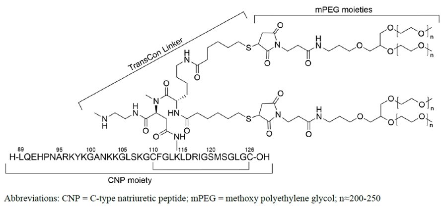 YUVIWEL for injection contains navepegritide, a C-type natriuretic peptide (CNP) analog. Navepegritide is a prodrug of active CNP consisting of a CNP moiety transiently conjugated to two branched 20 kDa methoxy polyethylene glycol (mPEG) moieties via a proprietary TransCon® Linker. The amino acid sequence of the CNP moiety is identical to the 38 amino acid sequence of residues 89-126 of human CNP. The structural formula of navepegritide is as follows: