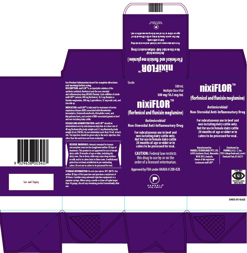 nixiFLOR™ is an injectable solution of the synthetic antibiotic florfenicol and the non-steroidal anti-inflammatory drug (NSAID) flunixin. Each milliliter of sterile nixiFLOR™ contains 300 mg florfenicol, 16.5 mg flunixin as flunixin meglumine, 300 mg 2-pyrrolidone, 35 mg malic acid, and triacetin qs.