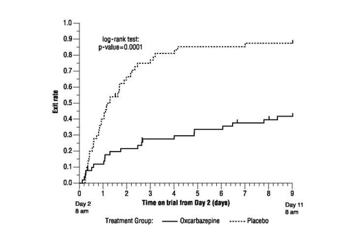 In this trial, 7.1% of oxcarbazepine-treated patients and 4% of placebo-treated patients experienced a cognitive adverse reaction. The risk of discontinuation for these events was about 6.5 times greater on oxcarbazepine than on placebo. In addition, 26% of oxcarbazepine-treated patients and 12% of placebo-treated patients experienced somnolence. The risk of discontinuation for somnolence was about 10 times greater on oxcarbazepine than on placebo. Finally, 28.7% of oxcarbazepine-treated patients and 6.4% of placebo-treated patients experienced ataxia or gait disturbances. The risk for discontinuation for these events was about 7 times greater on oxcarbazepine than on placebo.