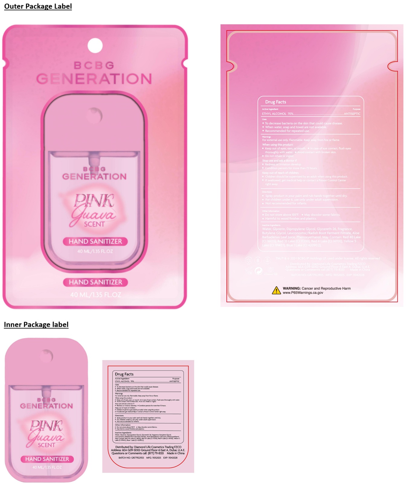 BCBG GENERATION HAND SANITIZER PINK Guava SCENT by is a Otc medication manufactured, distributed, or labeled by DIAMOND LIFE COSMETICS TRADING FZCO. Drug facts, warnings, and ingredients follow.