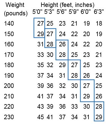 Below is a chart of body mass index (BMI) based on various heights and weights.