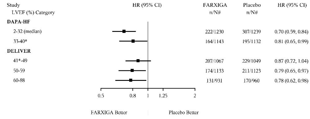 The treatment effect of FARXIGA on the composite endpoint of cardiovascular death, hospitalization for heart failure or urgent heart failure was consistent across the LVEF range as evaluated in DAPA-HF and DELIVER trials (Figure 11).