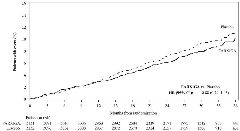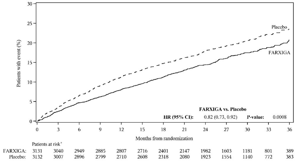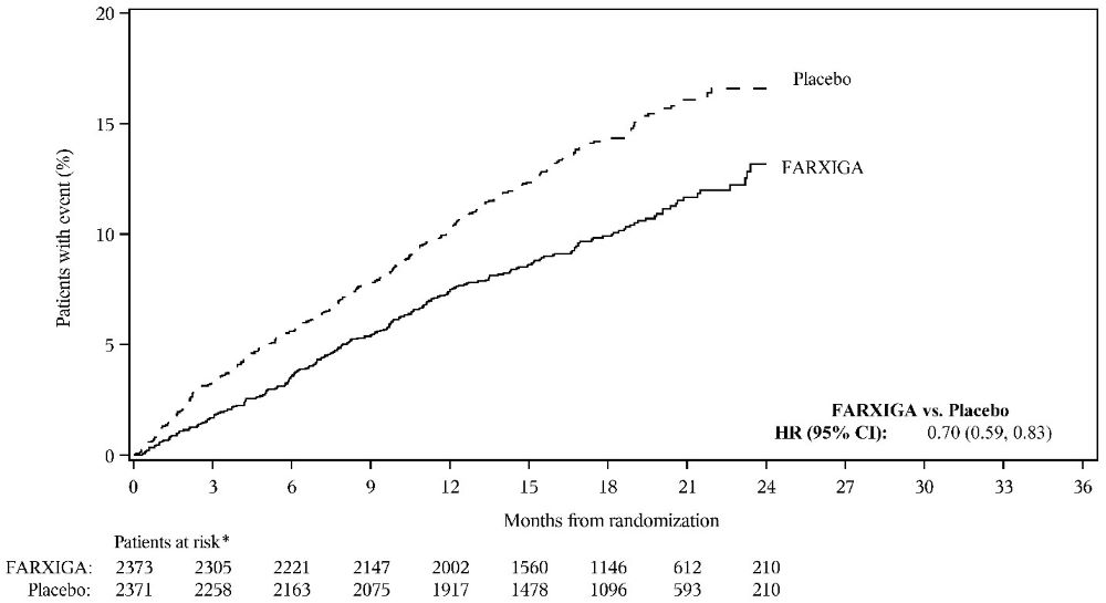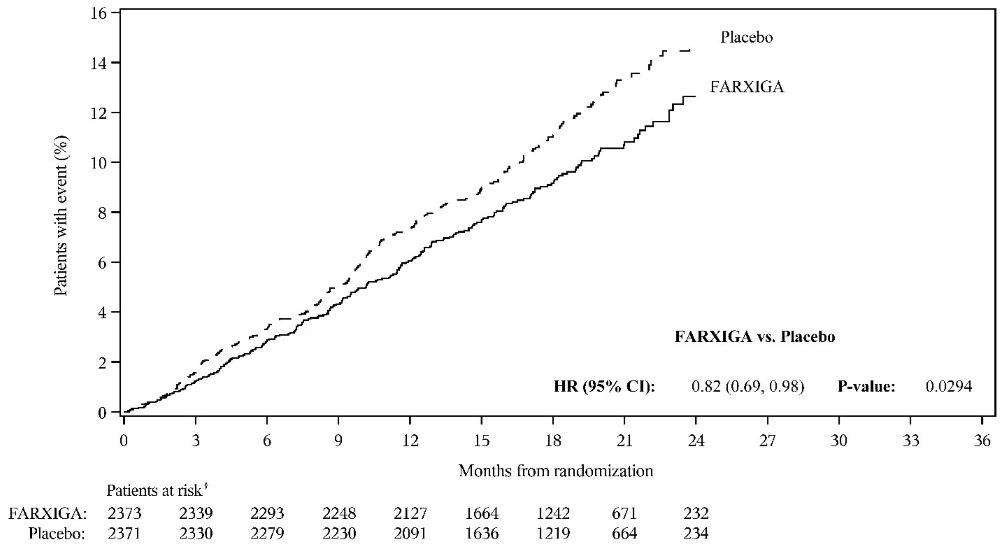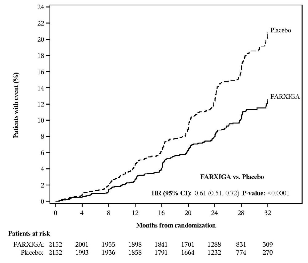 In both trials, all three components of the primary composite endpoint individually contributed to the treatment effect. In both trials, the FARXIGA and placebo event curves separated early and continued to diverge over the trial period (see Figures 7 and 9).