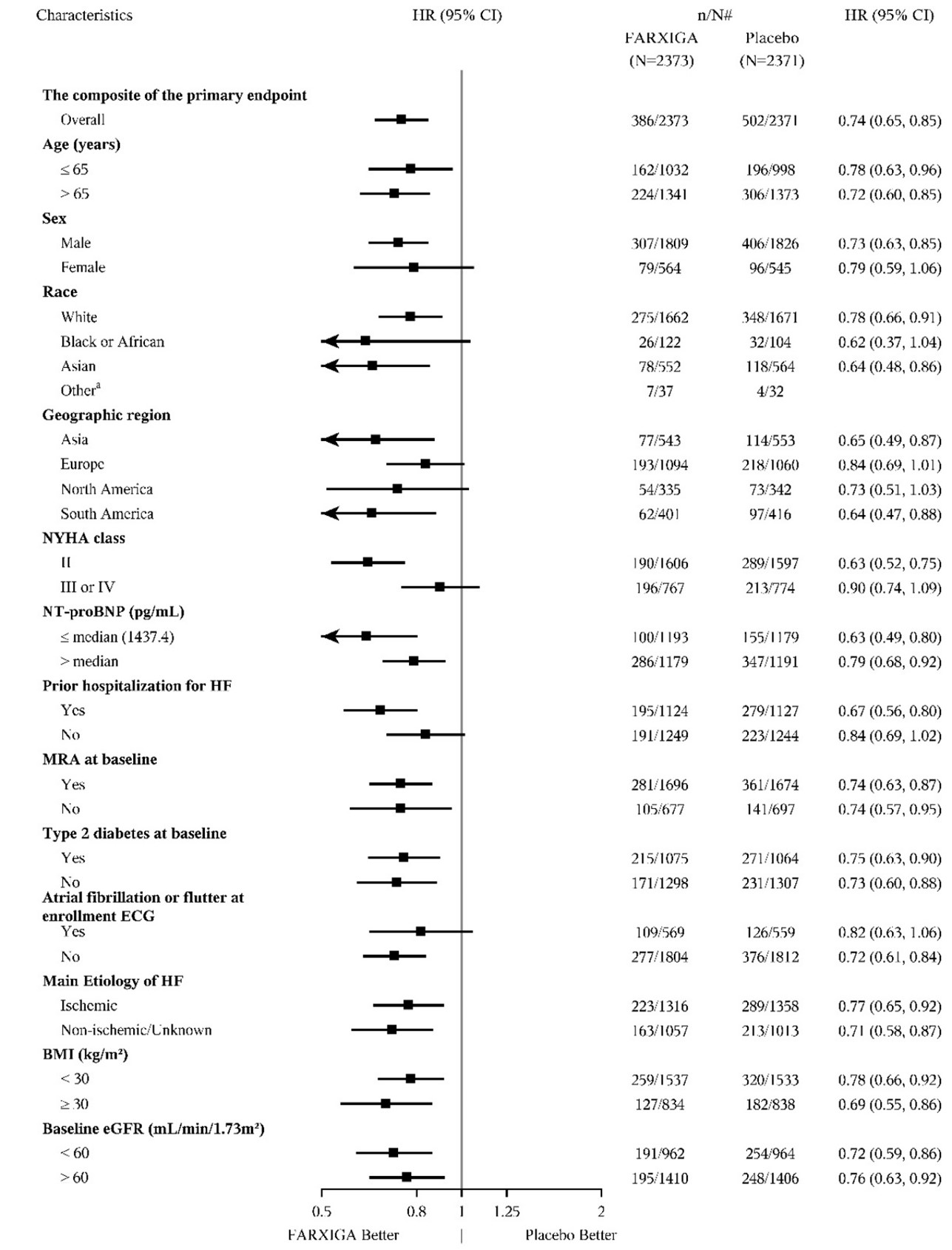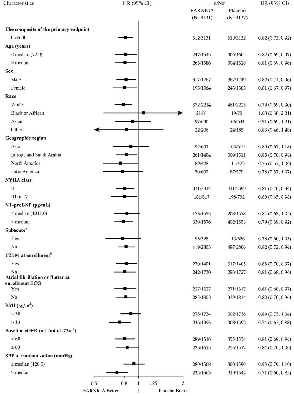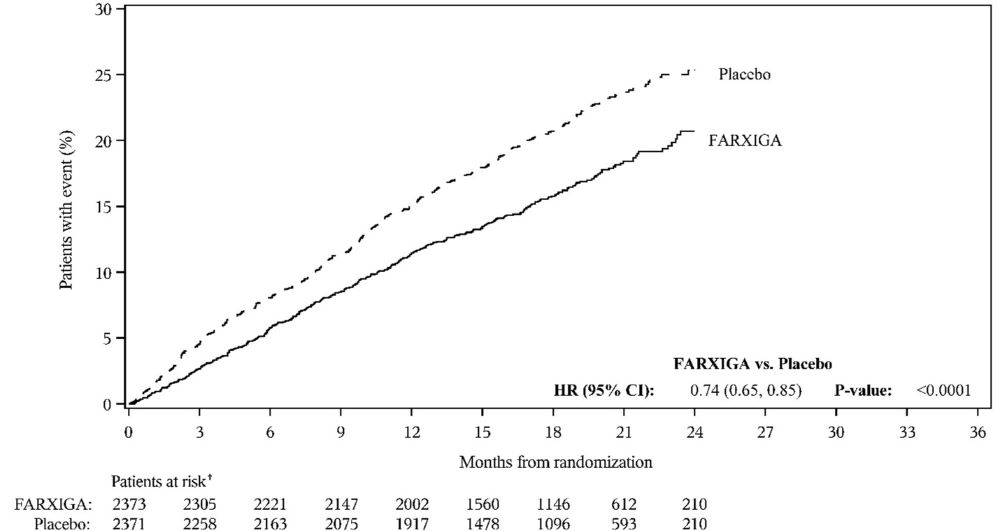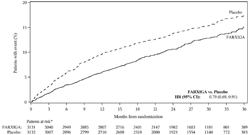 In both trials, all three components of the primary composite endpoint individually contributed to the treatment effect. In both trials, the FARXIGA and placebo event curves separated early and continued to diverge over the trial period (see Figures 7 and 9).
