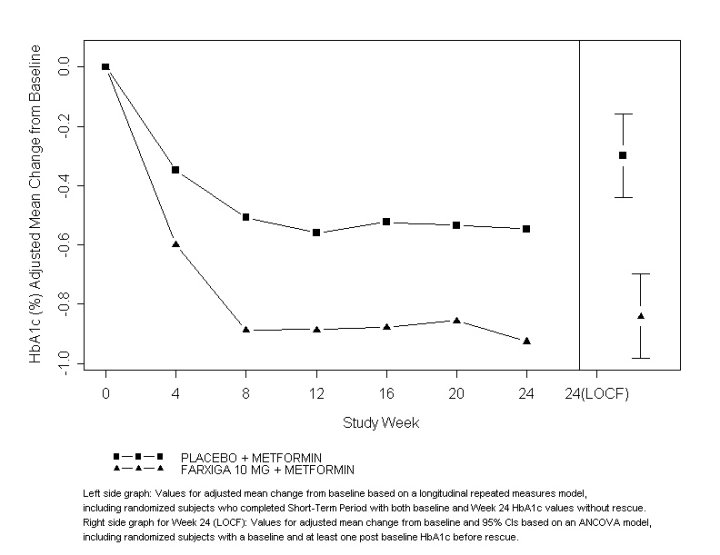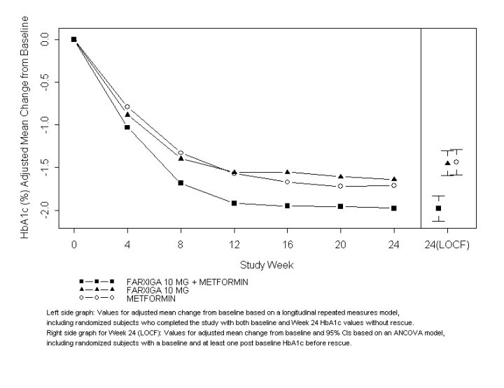 FARXIGA 10 mg was also evaluated in a larger glycemic control placebo-controlled trial pool in adult patients with type 2 diabetes mellitus. This pool combined 13 placebo-controlled trials, including 3 monotherapy trials, 9 add-on to background antidiabetic therapy trials, and an initial combination with metformin trial. Across these 13 trials, 2360 patients were treated once daily with FARXIGA 10 mg for a mean duration of exposure of 22 weeks. The mean age of the population was 59 years and 4% were older than 75 years. Fifty-eight percent (58%) of the population were male; 84% were White, 9% were Asian, and 3% were Black or African American. At baseline, the population had diabetes for an average of 9 years, had a mean HbA1c of 8.2%, and 30% had established microvascular disease. Baseline renal function was normal or mildly impaired in 88% of patients and moderately impaired in 11% of patients (mean eGFR 82 mL/min/1.73 m 2).