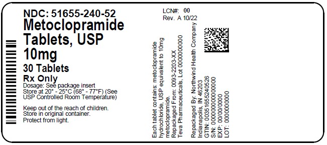 Each white, round, scored, debossed “TEVA” on one side and “2203” above the score on the other side, compressed metoclopramide tablet, USP contains metoclopramide hydrochloride, USP equivalent to 10 mg metoclopramide. Available in bottles of 6 (NDC: 51655-240-87) and bottles of 30 (NDC: 51655-240-52).