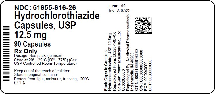 Hydrochlorothiazide Capsules, USP contain a white to off white powder filled in size “4” hard gelatin capsules with opaque light blue colored cap and opaque light blue colored body imprinted “SG” on cap and “146” on body with black ink. They are supplied in bottles of 30 (NDC: 51655-616-52) and bottles of 90 (NDC: 51655-616-26).