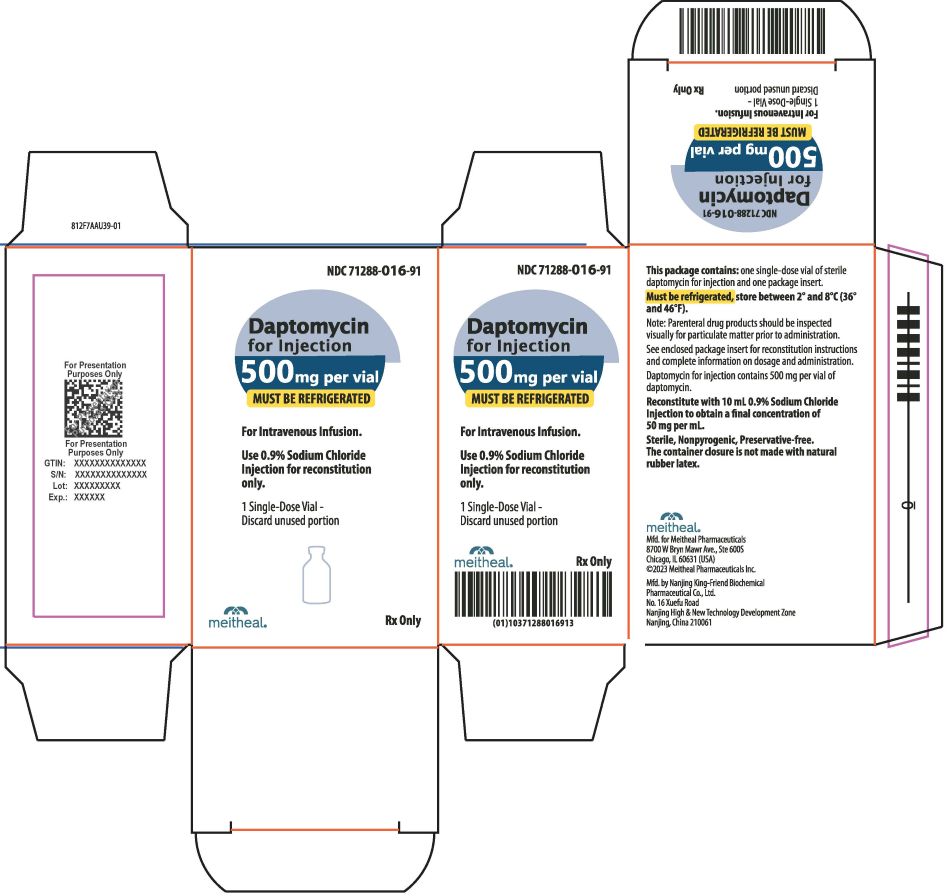 | 71288-016-91 | 500 mg of daptomycin in a 15 mL Single-Dose Vial | 1 vial per carton |