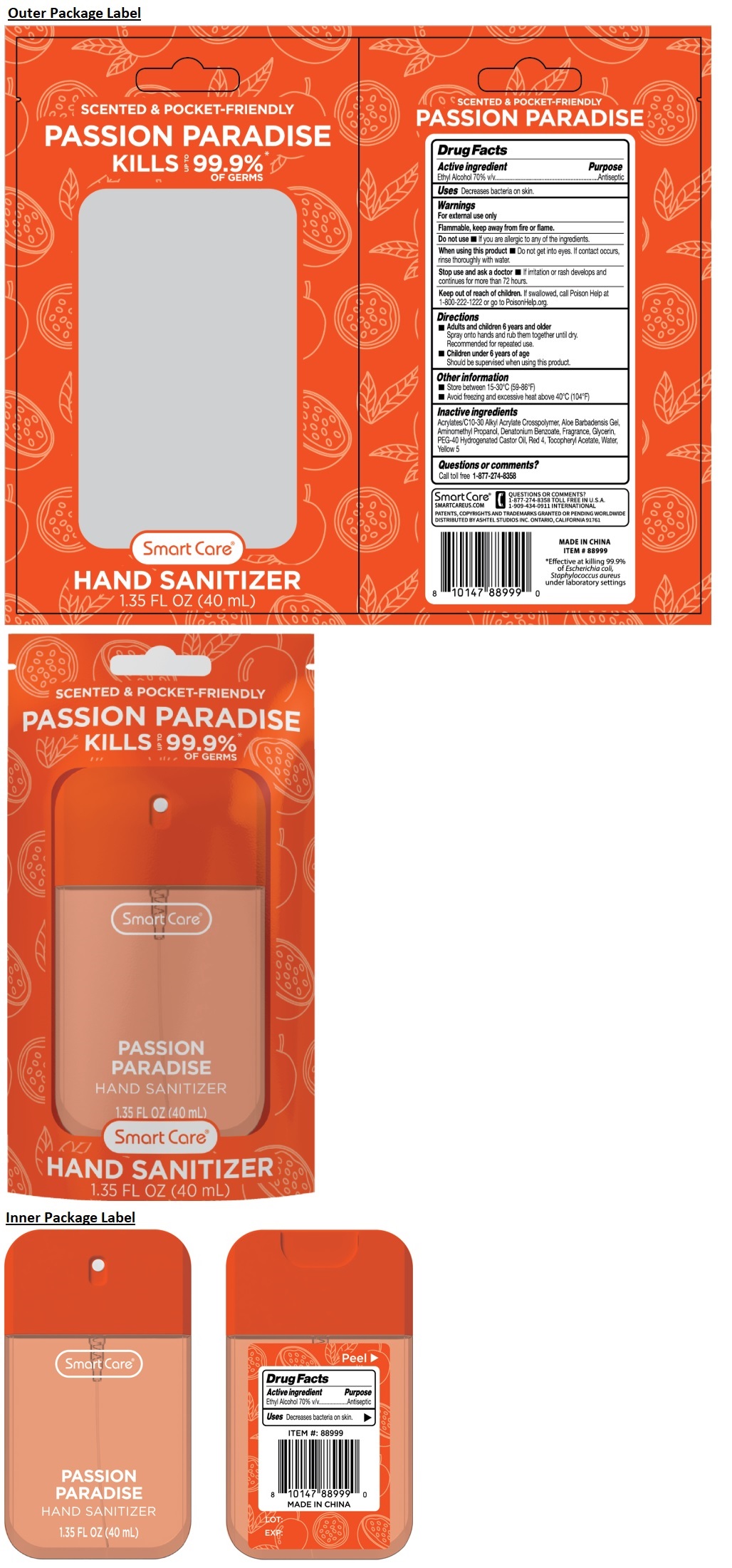 Smart Care PASSION PARADISE HAND SANITIZER by is a Otc medication manufactured, distributed, or labeled by Ashtel Studios Inc.. Drug facts, warnings, and ingredients follow.