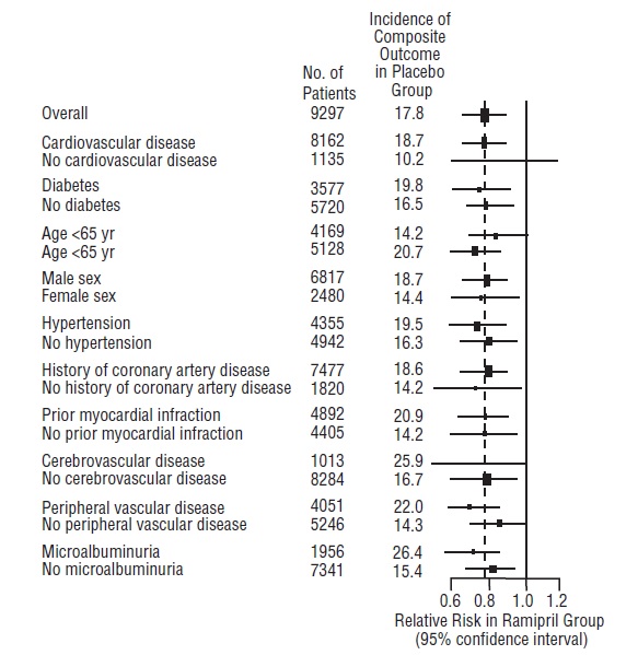 Figure 2. The Beneficial Effect of Treatment with Ramipril on the Composite Outcome of Myocardial Infarction, Stroke, or Death from Cardiovascular Causes Overall and in Various Subgroups
