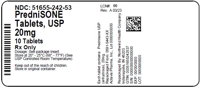 Prednisone tablets, USP 20 mg are flat faced, beveled, scored, round, peach tablets imprinted “ DAN DAN” and “ 5443” supplied in bottles of 10 (NDC: 51655-242-53).