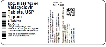 Valacyclovir Tablets USP, 1 gram are blue, film-coated, capsule shaped tablets with a partial scorebar on both sides containing “F” on one side and “8” and “3” on the otherside containing 1.112 grams of valacyclovir hydrochloride equivalent to 1 gram of valacyclovir.