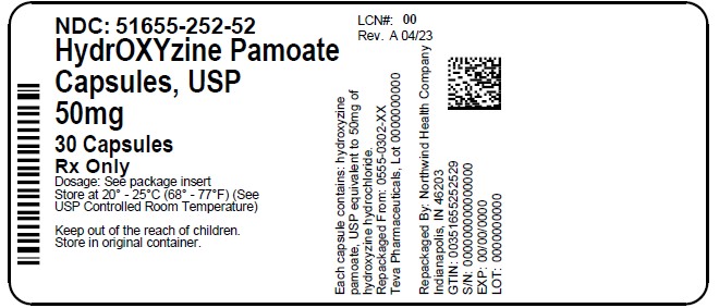 Hydroxyzine pamoate capsules, USP (hydroxyzine pamoate, USP equivalent to hydroxyzine hydrochloride), 50 mg are available as light yellow opaque cap and maroon opaque body filled with yellow powder, imprinted in black ink stylized “barr” over “302” on one piece and “50” on the other piece, packaged in bottles of 30 (NDC: 51655-252-52).