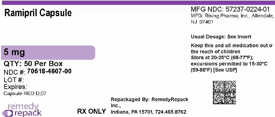 Ramipril Capsules USP, 5 mg are red/red size ‘4’ hard gelatin capsules imprinted with ‘D’ on red cap and ‘07’ on red body with black edible ink filled with white to almost white powder..