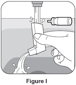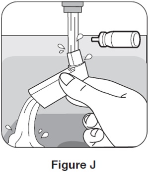 Step 9. Turn the plastic actuator upside down and run warm water through the mouthpiece for about 30 seconds. See Figure J.