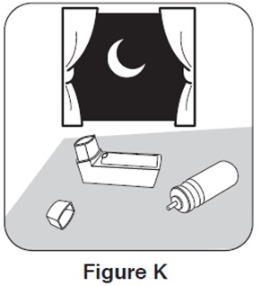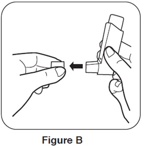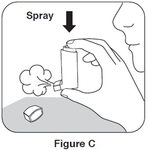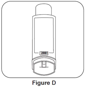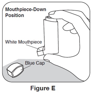 Step 2. Hold the inhaler with the mouthpiece down and shake it well. See Figure E.